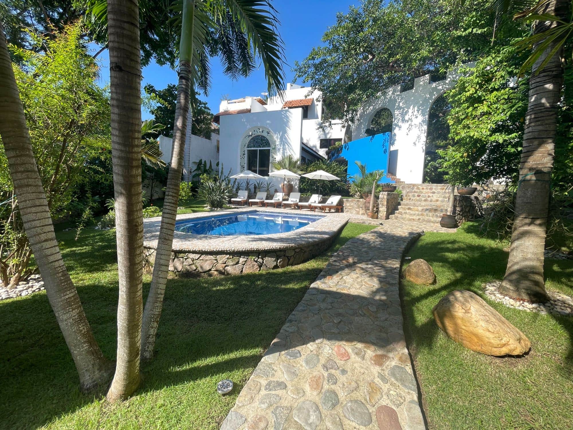 Just steps from the beach in the desirable north beach area of Sayulita in a neighborhood of beautiful homes, this extraordinarily spacious and private 4 bedroom (sleeps 8), 3 bath villa is designed to provide an expansively relaxed setting for both work and play. Like a lush botanical retreat, Casa Salate presents you with a thoughtful combination of traditional and modern Mexican architecture, and is surrounded by a tropical garden graced with fruit trees of star fruit, mandarin and pomegranate, shaded by a giant native Salate tree and surrounded by a wall draped in multicolored bougainvillea.